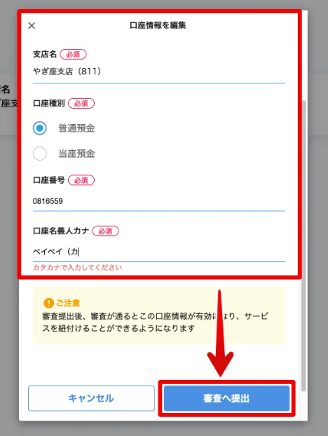 ❻ 金融機関の口座を確認し「審査に提出」をクリックします